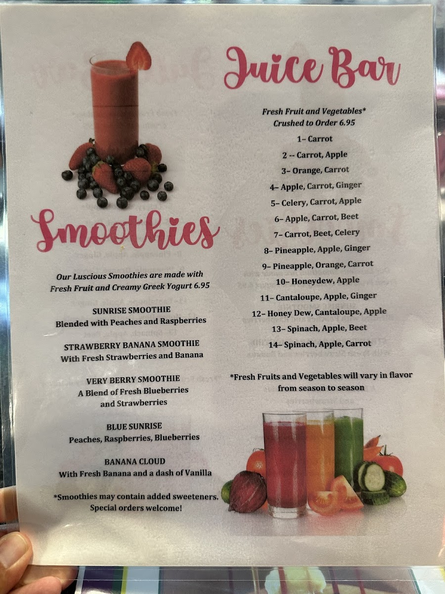 Smoothies are available with options like Sunrise Smoothie, Strawberry Banana Smoothie, Very Berry Smoothie, Blue Sunrise, and Banana Cloud, offering lighter beverage choices.